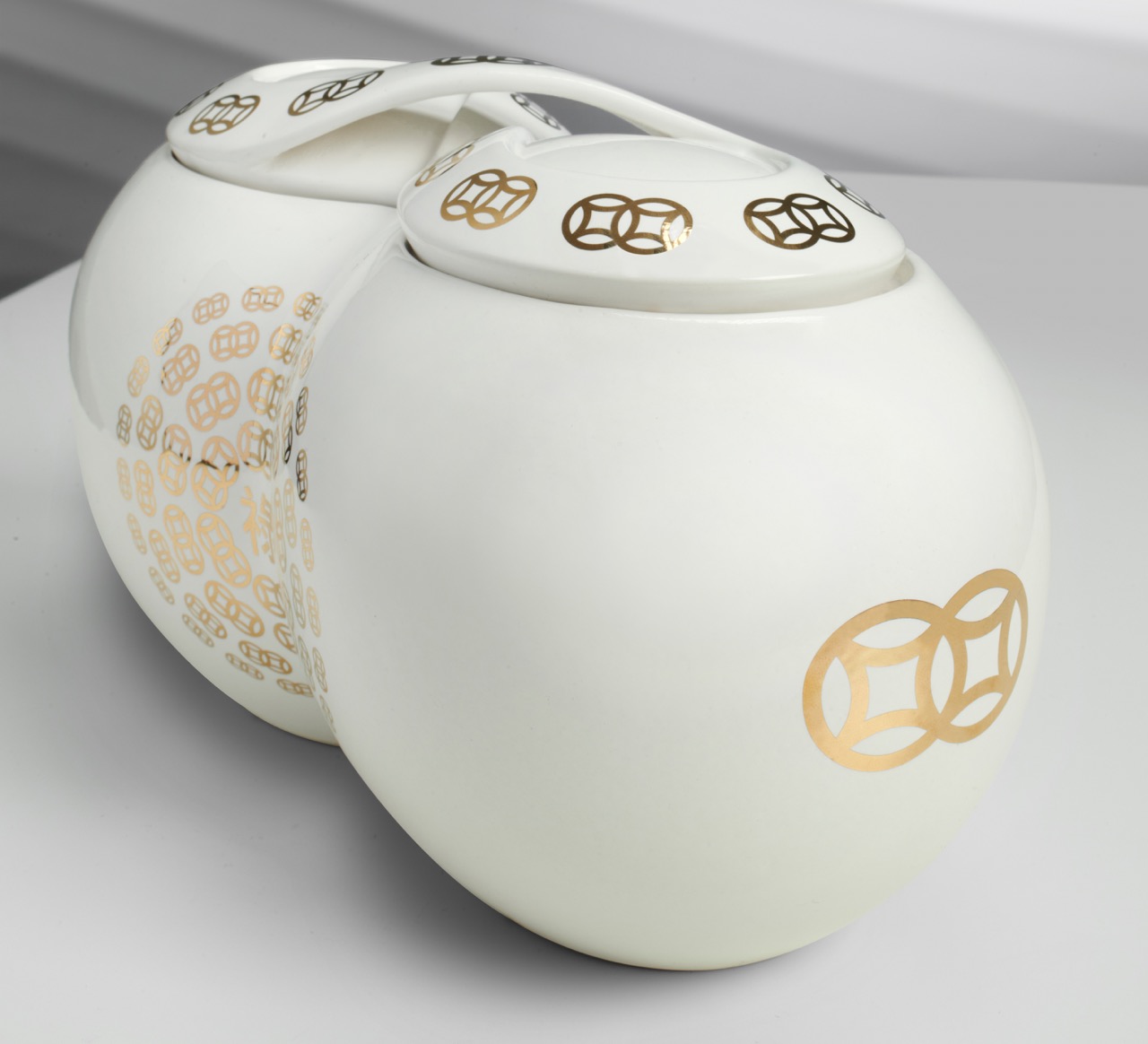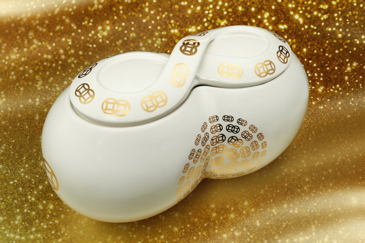 釉燒的陶瓷盆身前後貼上黃金錢幣圍繞的「百福」與「百祿」圖