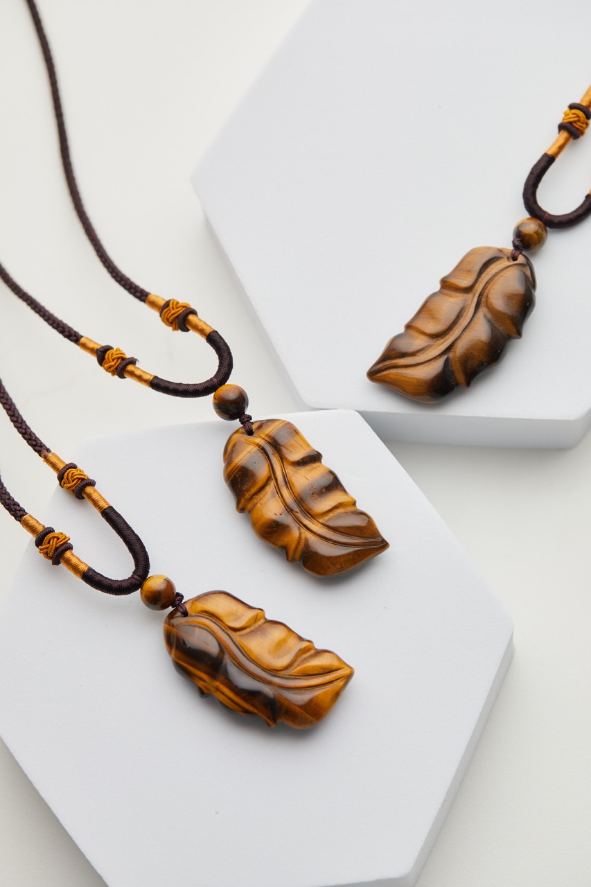 3. 「黃金虎眼石一葉致富」的「棕色」編繩輔以串珠,棕色與樹幹的顏色相近,沉穩的色調給人可靠、樸實的感覺,以及這一顆串珠的飽滿、珠圓光潤,更添加了幸福和連綿不絕的圓滿,與「黃金虎眼石一葉致富」珮飾相輝映,更有貴人如影隨形的象徵。